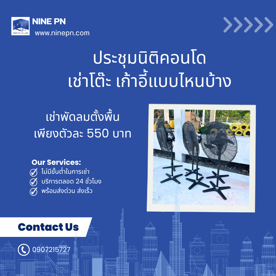ในบางงาน โดยเฉพาะงานที่จัดในพื้นที่เปิดโล่ง หรือในห้องประชุมขนาดใหญ่ที่ต้องการการระบายอากาศที่ดี พัดลมตั้งพื้นเป็นสิ่งจำเป็น NINE PN มีบริการให้เช่าพัดลมตั้งพื้น เพื่อเพิ่มความเย็นสบายให้กับผู้เข้าร่วมงาน ช่วยให้ทุกคนรู้สึกสดชื่นและมีสมาธิกับกิจกรรมต่างๆ ได้อย่างเต็มที่ ด้วยราคาเพียงตัวละ 550 บาท คุณจะมั่นใจได้ว่างานของคุณจะราบรื่น ไม่มีใครรู้สึกร้อนอบอ้าว