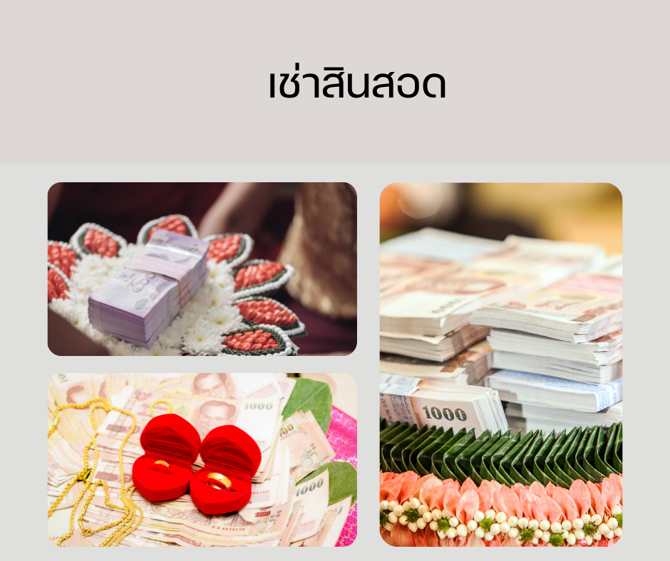 3.เช่าสินสอด ไม่น่าเชื่อเลยว่าแม้แต่สินสอดเองก็มีบริการให้เช่า แต่ก่อนที่คู่บ่าวสาวจะตัดสินใจเช่น ควรบอกกล่าวผู้ที่เกี่ยวข้องให้เรียบร้อย เพื่อไม่ให้เกิดความเข้าใจผิดกัน