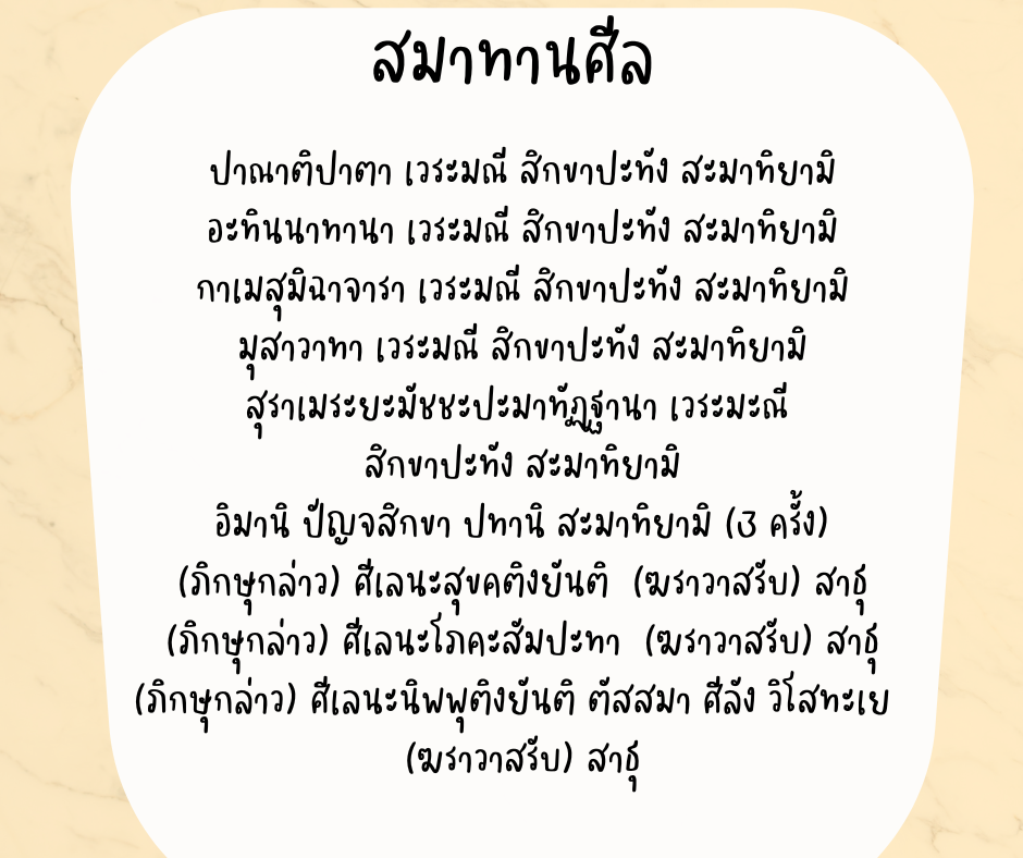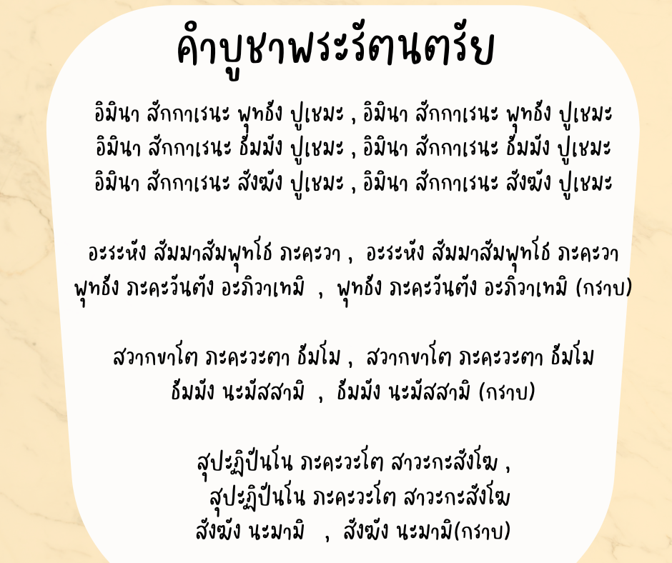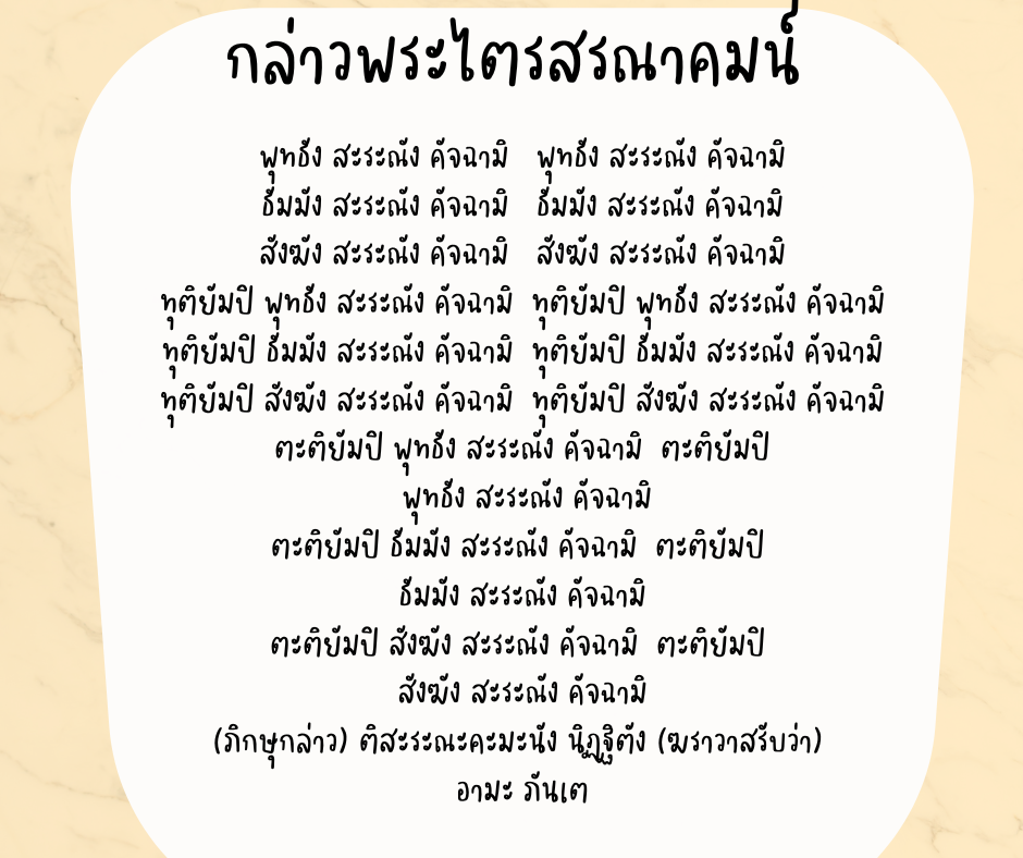 พุทธัง สะระณัง คัจฉามิ (ข้าพเจ้าขอถึงพระพุทธเจ้าเป็นที่พึ่ง) ธัมมัง สะระณัง คัจฉามิ (ข้าพเจ้าขอถึงพระธรรมเป็นที่พึ่ง) สังฆัง สะระณัง คัจฉามิ (ข้าพเจ้าขอถึงพระสงฆ์เป็นที่พึ่ง)
