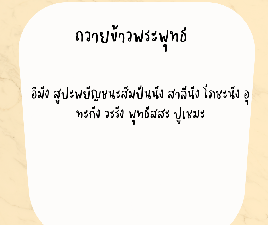 อะระหัง สัมมาสัมพุทโธ ภะคะวา พุทธัง ภะคะวันตัง อะภิวาเทมิ (กราบ 1 ครั้ง)