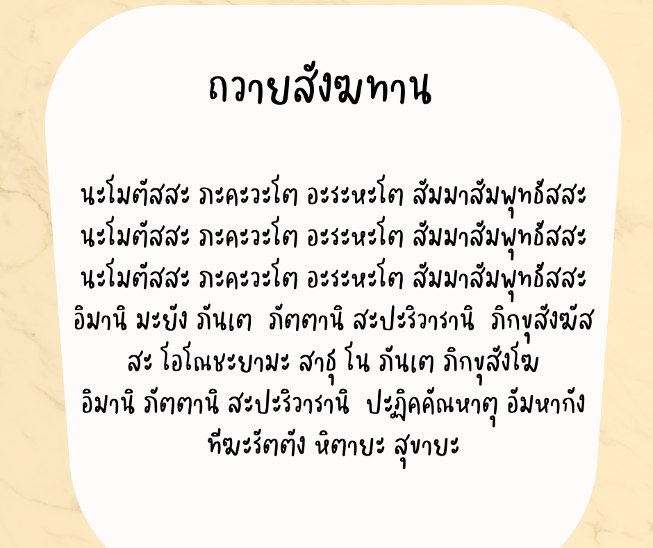 สุปะฏิปันโน ภะคะวะโต สาวะกะสังโฆ สังฆัง นะมามิ (กราบ 1 ครั้ง)