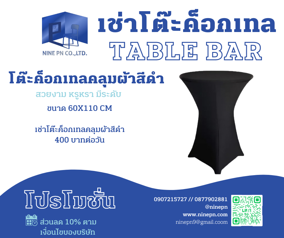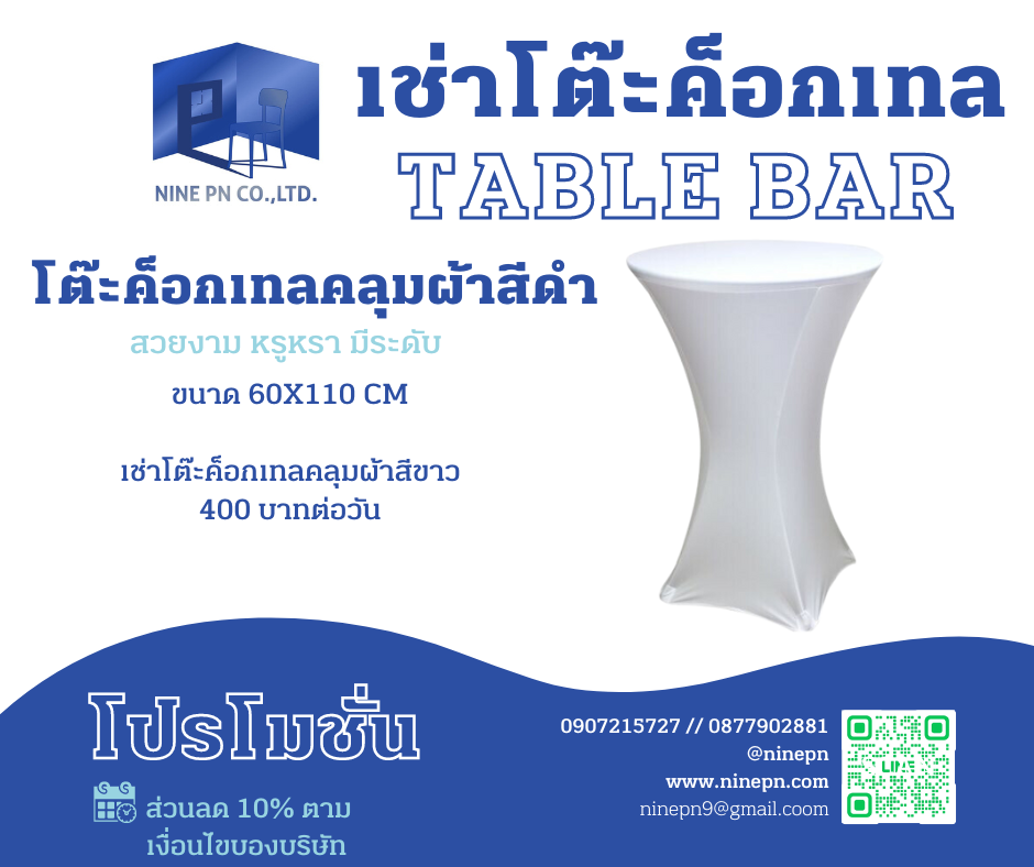 2.เช่าโต๊ะค็อกเทล แบบคลุมผ้า โดยทาง 9PN มีให้บริการแบบคลุมผ้า ทั้งขาว สีดำ สามารถเลือกใช้ได้ทั้งแบบเรียบและแบบตึง